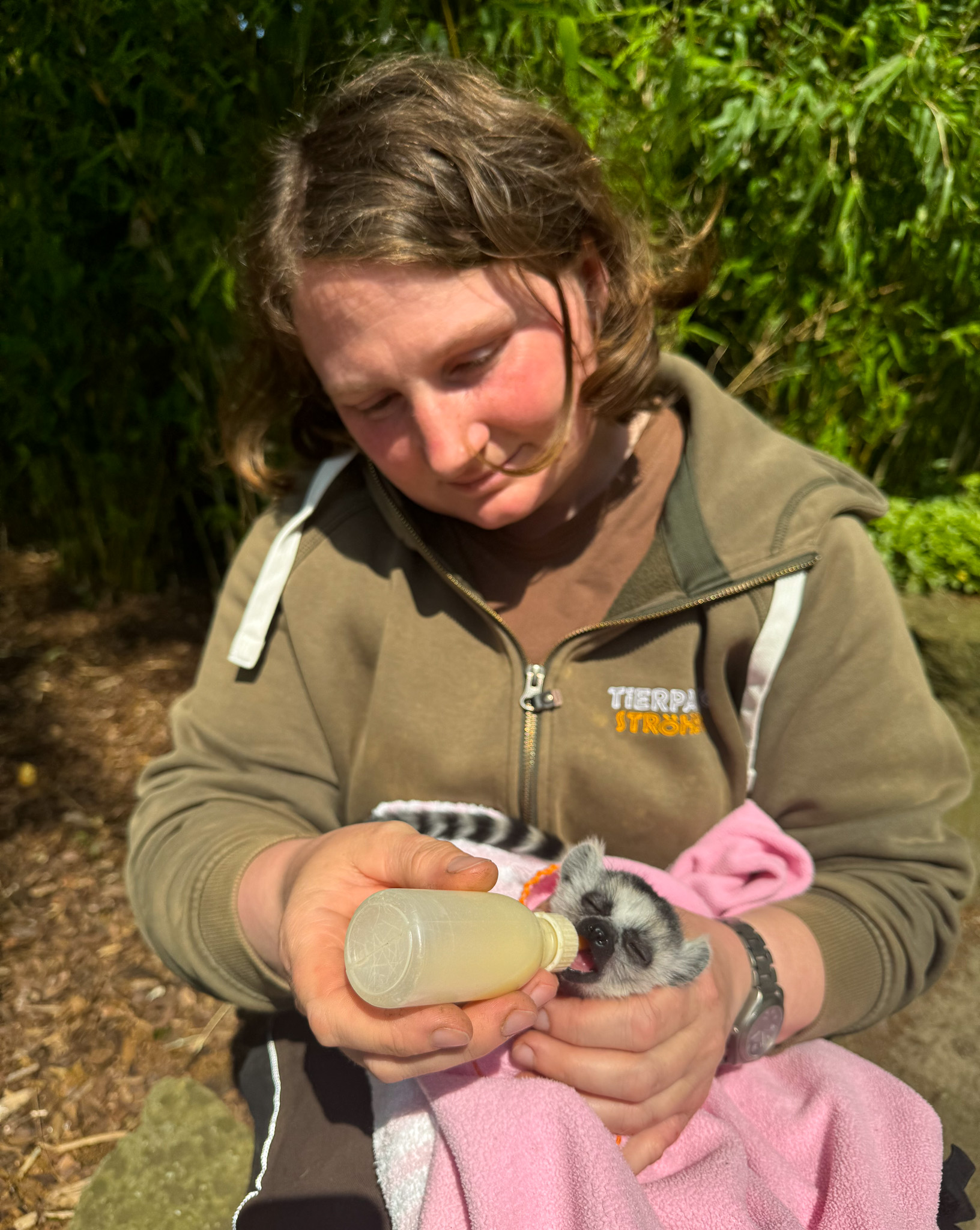 Das verstoßene Jungtier wird nun per Hand mit einer Flasche gefüttert. Das zierliche Männchen weicht seiner Ersatz-Mutterund Tierpflegerin Frauke Niehaus nicht mehr von der Seite. Mit Blick auf das verunglückte Jungtier zeigt sie sich optimistisch: "Er hat in seiner Entwicklung bereits einen großen Fortschritt gemacht.“ Dabei war erst nicht sicher, ob er durchkommt, denn die Umstellung auf die Handaufzucht bedeutet auch für das Jungtier ungemein viel Stress. „Es ist ja nicht nur, dass das Junge nun lernen muss, Menschen als Sozialpartner zu akzeptieren, sondern auch die Futterumstellung auf die Flasche.“
