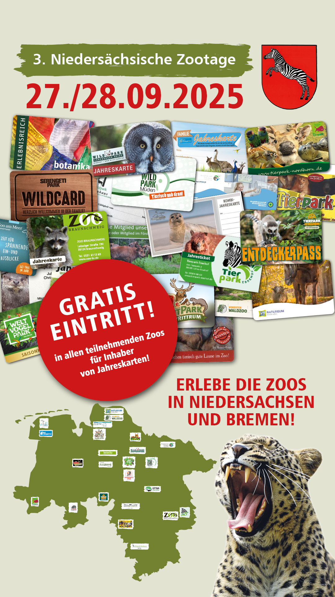 Nach dem großen Erfolg im letzten Jahr veranstalten die zoologischen Einrichtungen in Niedersachsen und Bremen am 27. und 28. September 2025 zum dritten Mal die „Niedersächsischen Zootage“. An diesen Tagen erkennen die Zoos die Jahreskarten der jeweils anderen mitmachenden Einrichtungen an. Wer also im Besitz einer gültigen Jahreskarte eines der 24 teilnehmenden Zoos ist, hat an diesen Tagen auch freien Eintritt in den anderen teilnehmenden Einrichtungen.