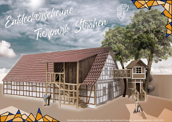 Auf ca. 200m² wurde ein Labyrinth in mehreren Ebenen geschaffen, bei dem die Kinder immer neue Räume betreten, in denen sie in unterschiedlichste Rollen schlüpfen können. „Spielen ist Hypnose“ mit diesem Satz überzeugte Bergmann den Tierparkleiter Nils Ismer sein Spielkonzept in Ströhen im Tierpark zu installieren. Es geht darum, für die Kinder neue Welten zu öffnen und mit Hilfe ihrer Fantasie neue Rollen anzunehmen und spielerisch auszufüllen.