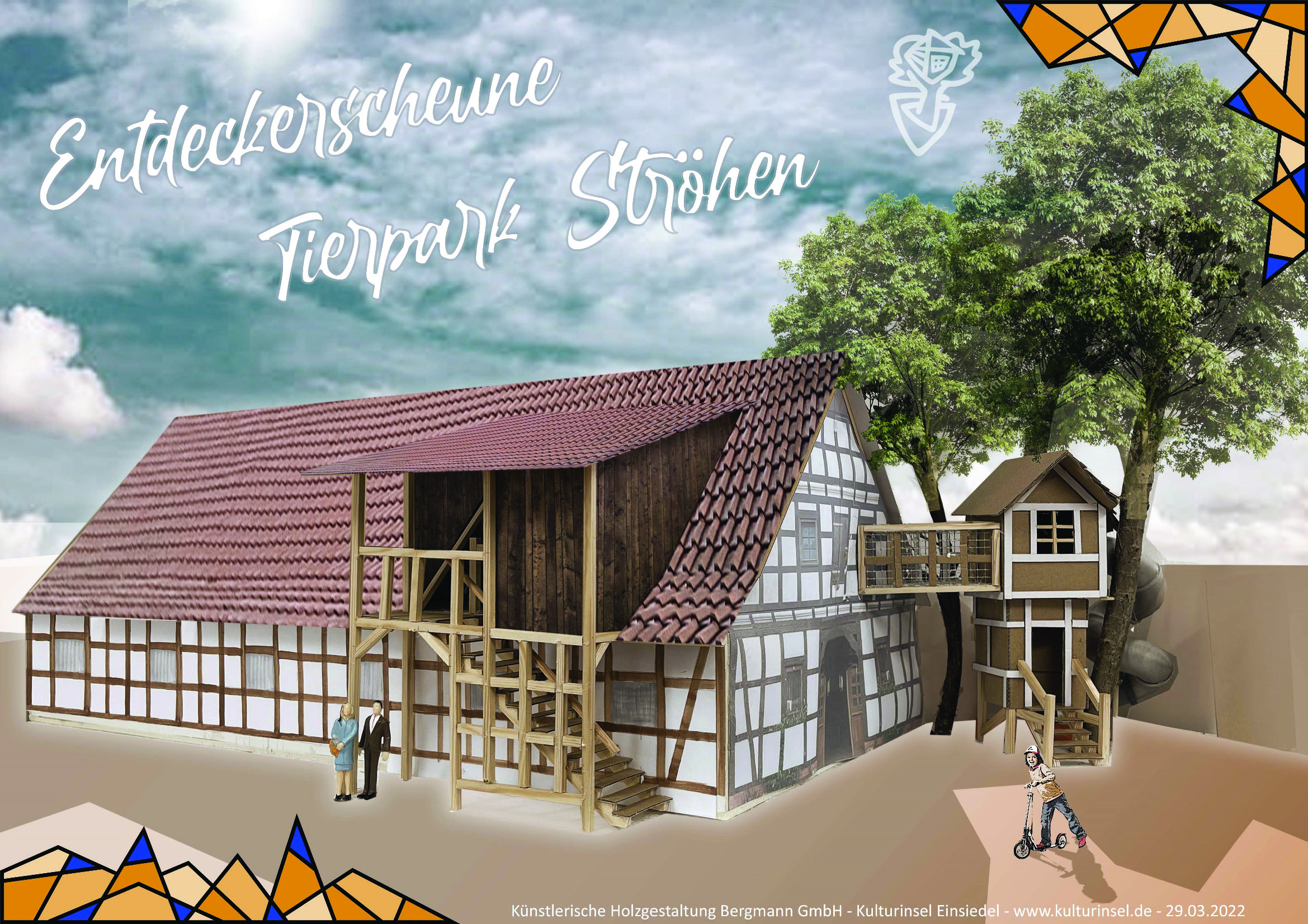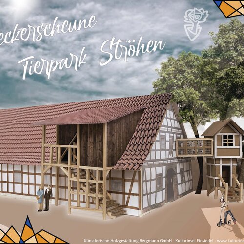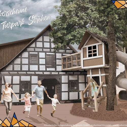 Auf ca. 200m² wurde ein Labyrinth in mehreren Ebenen geschaffen, bei dem die Kinder immer neue Räume betreten, in denen sie in unterschiedlichste Rollen schlüpfen können. „Spielen ist Hypnose“ mit diesem Satz überzeugte Bergmann den Tierparkleiter Nils Ismer sein Spielkonzept in Ströhen im Tierpark zu installieren. Es geht darum, für die Kinder neue Welten zu öffnen und mit Hilfe ihrer Fantasie neue Rollen anzunehmen und spielerisch auszufüllen.